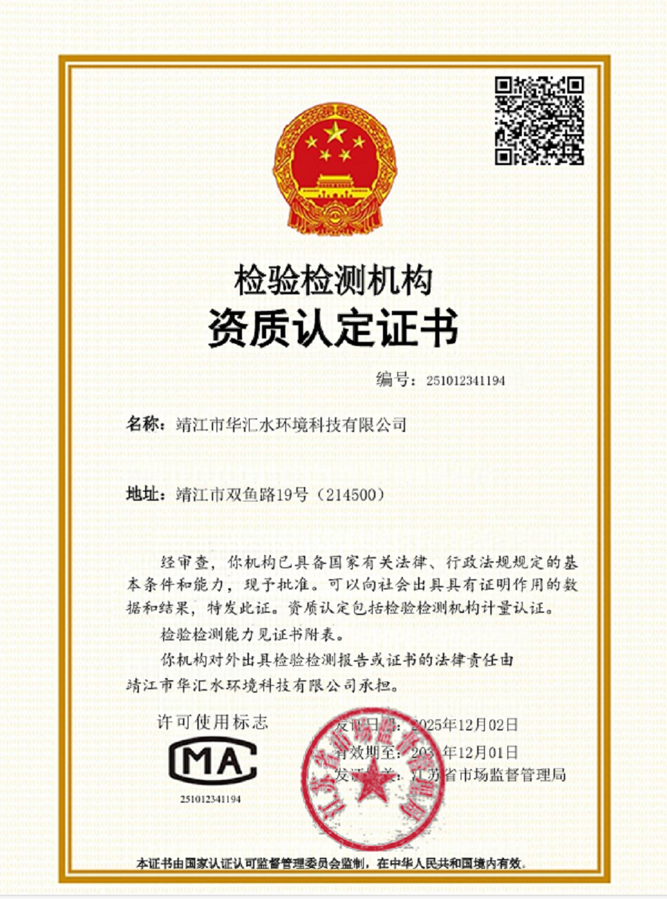 近日,靖江市华汇水环境科技有限公司顺利取得由江苏省市场监督管理局颁发的“检验检测机构资质认定证书(CMA)”,标志着其在水质检测领域的能力和水平达到了国家的最新标准,为保障居民群众的饮用水安全提供强有力的技术支撑。