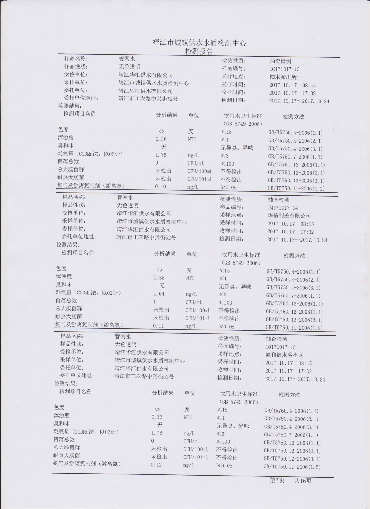 管网水质检测报告2017.10.17