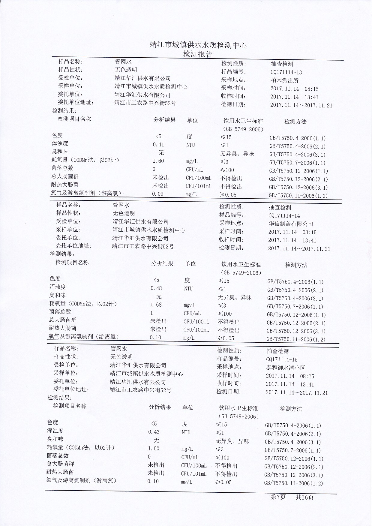 管网水检测报告2017.11.14