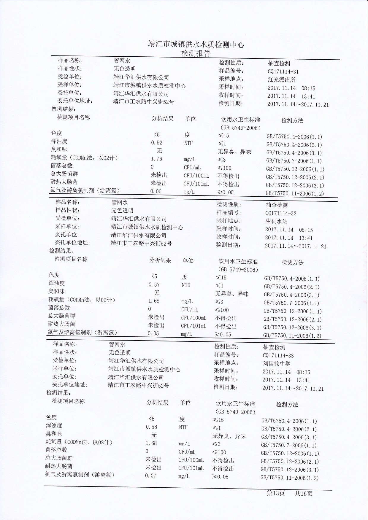 管网水检测报告2017.11.14