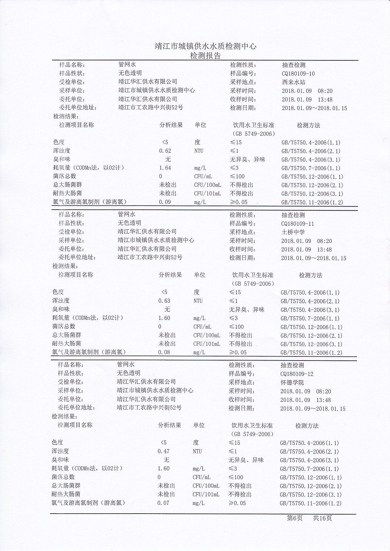 管网水检测报告2018.01.09