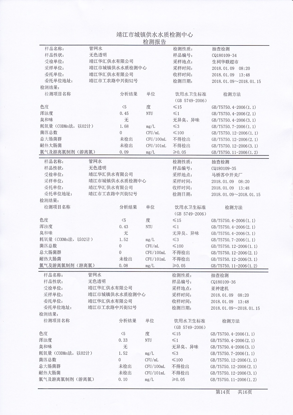 管网水检测报告2018.01.16
