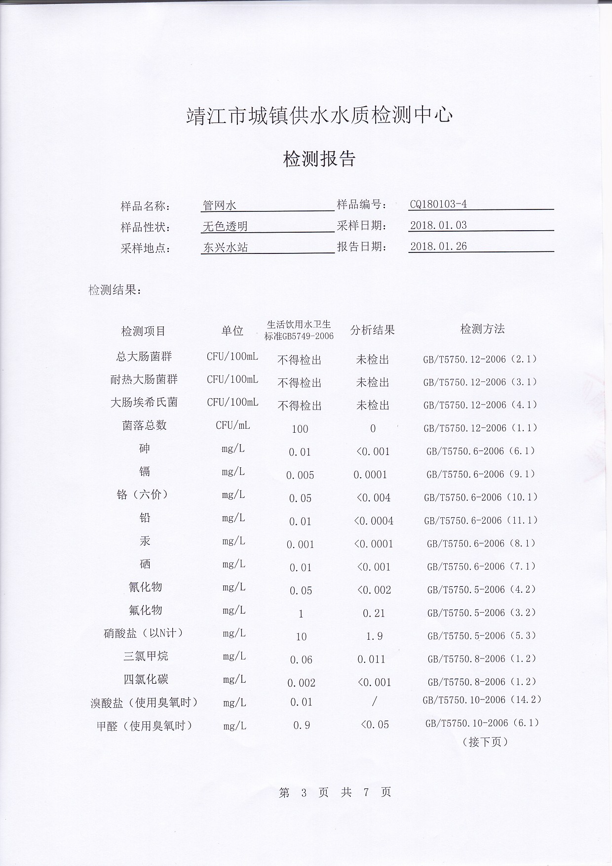 出厂水检测报告2018.01.03