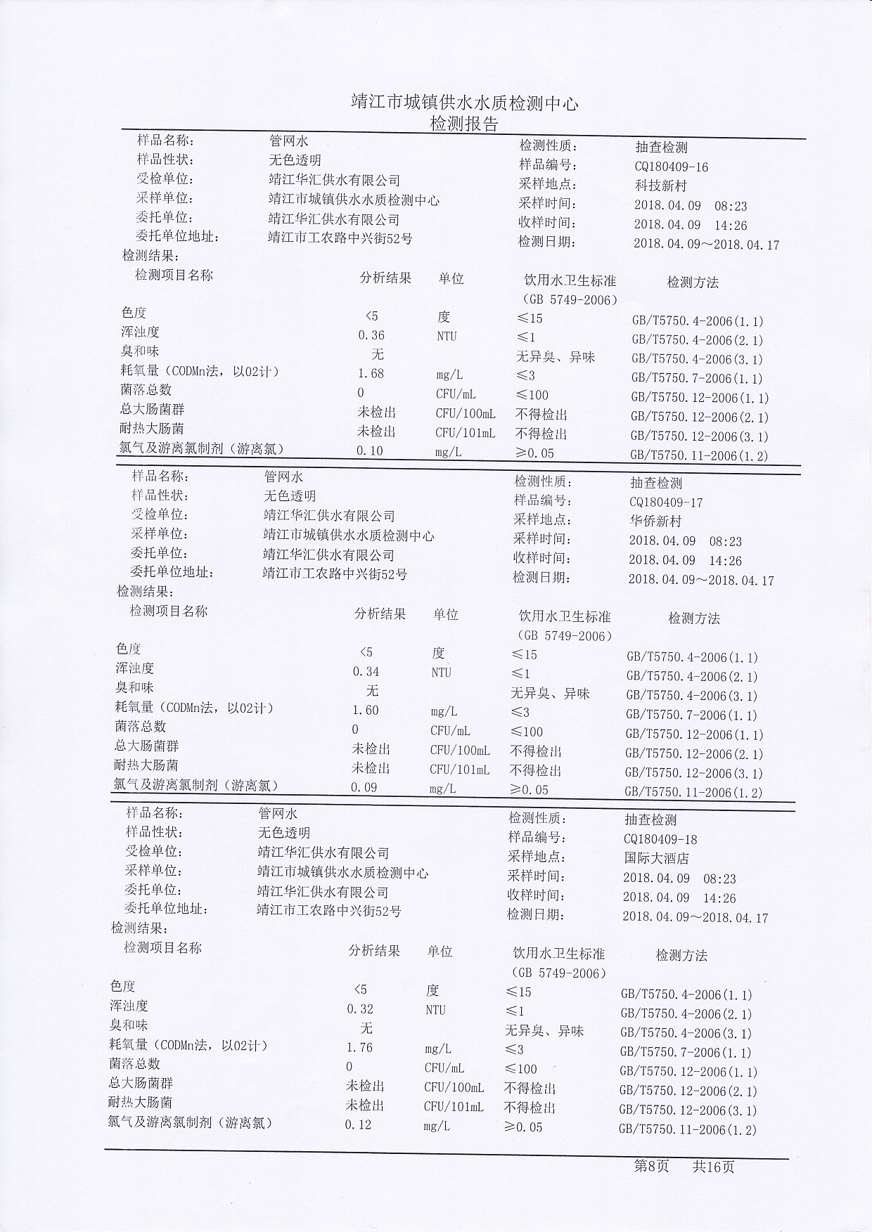 管网水检测报告2018.04.09